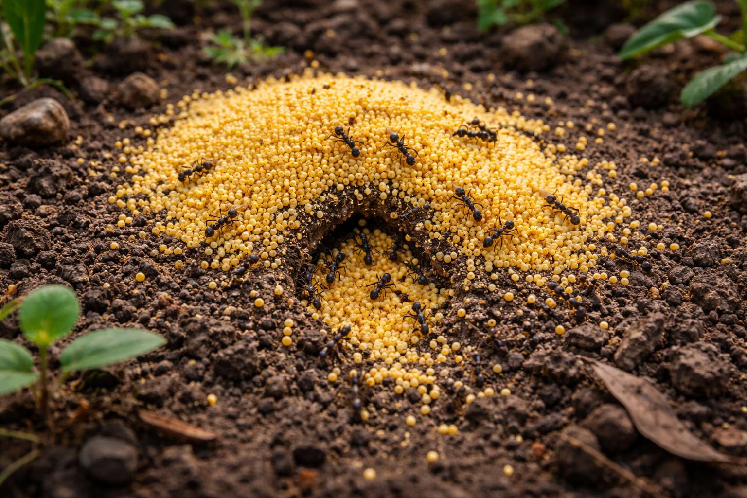 Kroupy z prosa má netradiční účinek na hmyz, který se z neškodného produktu mění v účinný nástroj pro čištění lokality. Zahradní škůdci si díky vizuální a hmatové podobnosti pletou malá žlutá zrnka s vajíčky svých děloh. Dělnice je aktivně přenášejí hluboko do mraveniště. Po vstupu do hnízda kroupy intenzivně bobtnají od půdní vlhkosti a fyzicky blokují podzemní chodby. Hmyz navíc není schopen nabobtnalý škrob strávit, což při pokusu o konzumaci zásob vede k úhynu kolonie.