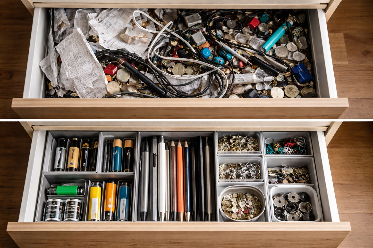 Šeky, staré baterie, kancelářské sponky a knoflíky roztroušené na povrchu vytvářejí vážný hluk. vizuální hluk. Tento faktor přímo ovlivňuje úroveň vnitřního napětí a brání nám v plném odpočinku po dlouhém dni. Náš mozek si množství drobných předmětů přečte jako nedokončené úkoly, díky čemuž se cítíme neustále unavení, a to i ve vlastním obývacím pokoji.