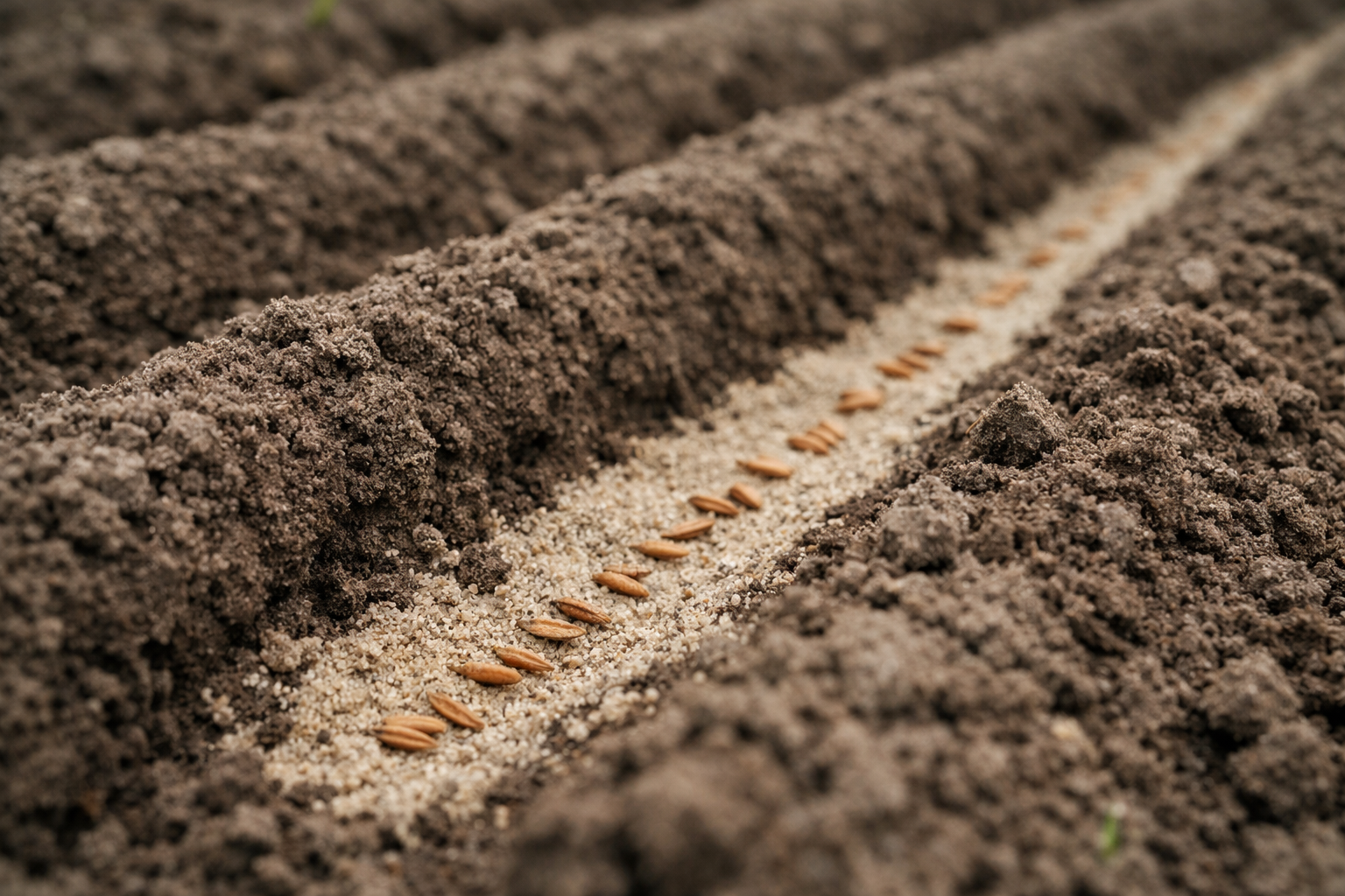 – Vybírejte pouze čerstvá semena z aktuálního roku, protože jejich klíčivost se časem rychle snižuje. – Semena předem omyjte v teplé vodě, abyste částečně odstranili éterické oleje, které brání klíčení. – Vytvořte brázdy v přísně stejné hloubce a zhutněte jejich dno pomocí nářaďové frézy.