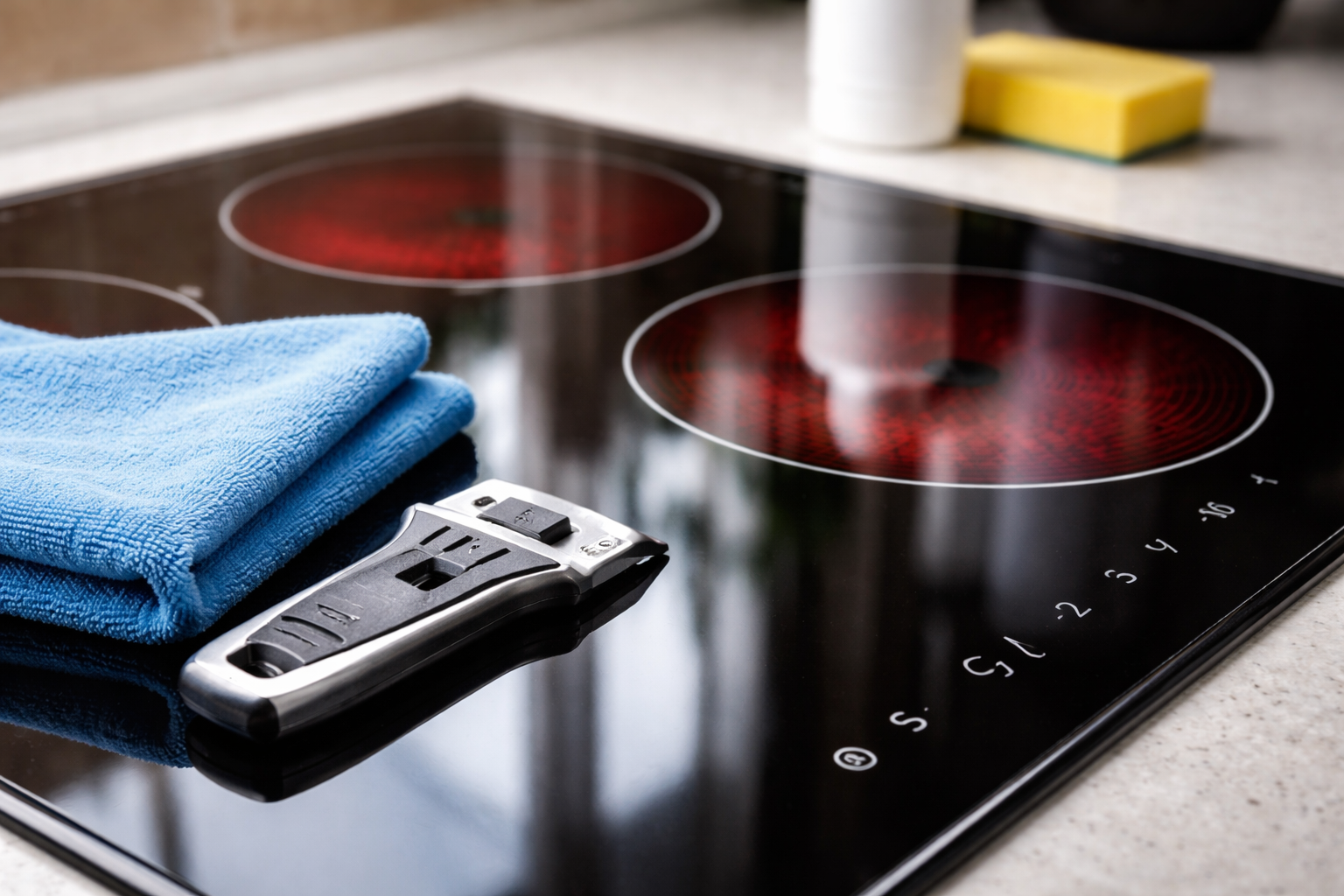 Škrabka na sklokeramiku jemně odřezává husté saze, aniž by poškodila hladký povrch.
