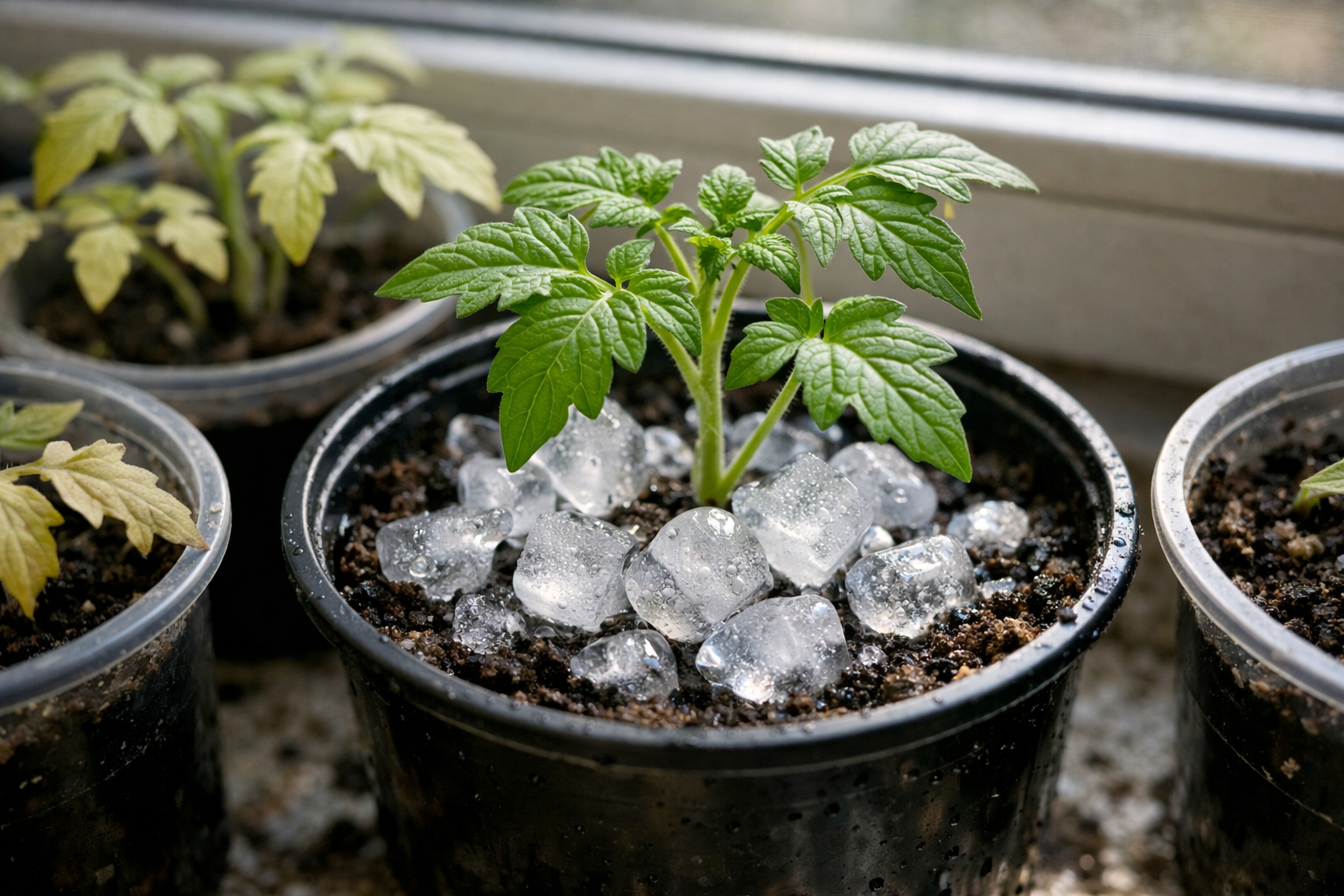 Když jarní slunce začne svítit přes okenní sklo, teplota půdy v malých plastových kelímcích rychle stoupá. Nebezpečná teplotní streskterý způsobuje stagnaci kořenového systému. Za takových podmínek se kořenový systém zcela zastaví. asimilace dusíku a mikroživin. Rychlá chlorozaChloróza[chlorosis]při níž mladé listy ztrácejí své syté zbarvení.