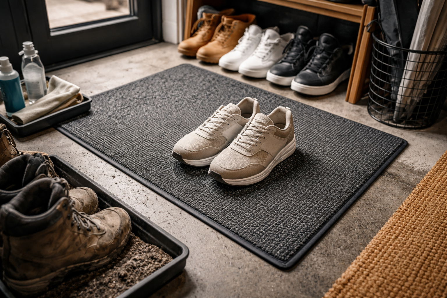 Moje metoda spočívá v tom, že nečistoty neopouštějí hranice kurtové rohože. Vyžaduje to disciplínu, ale ušetří vás to nutnosti každý večer vytírat celou rovnou podlahu.