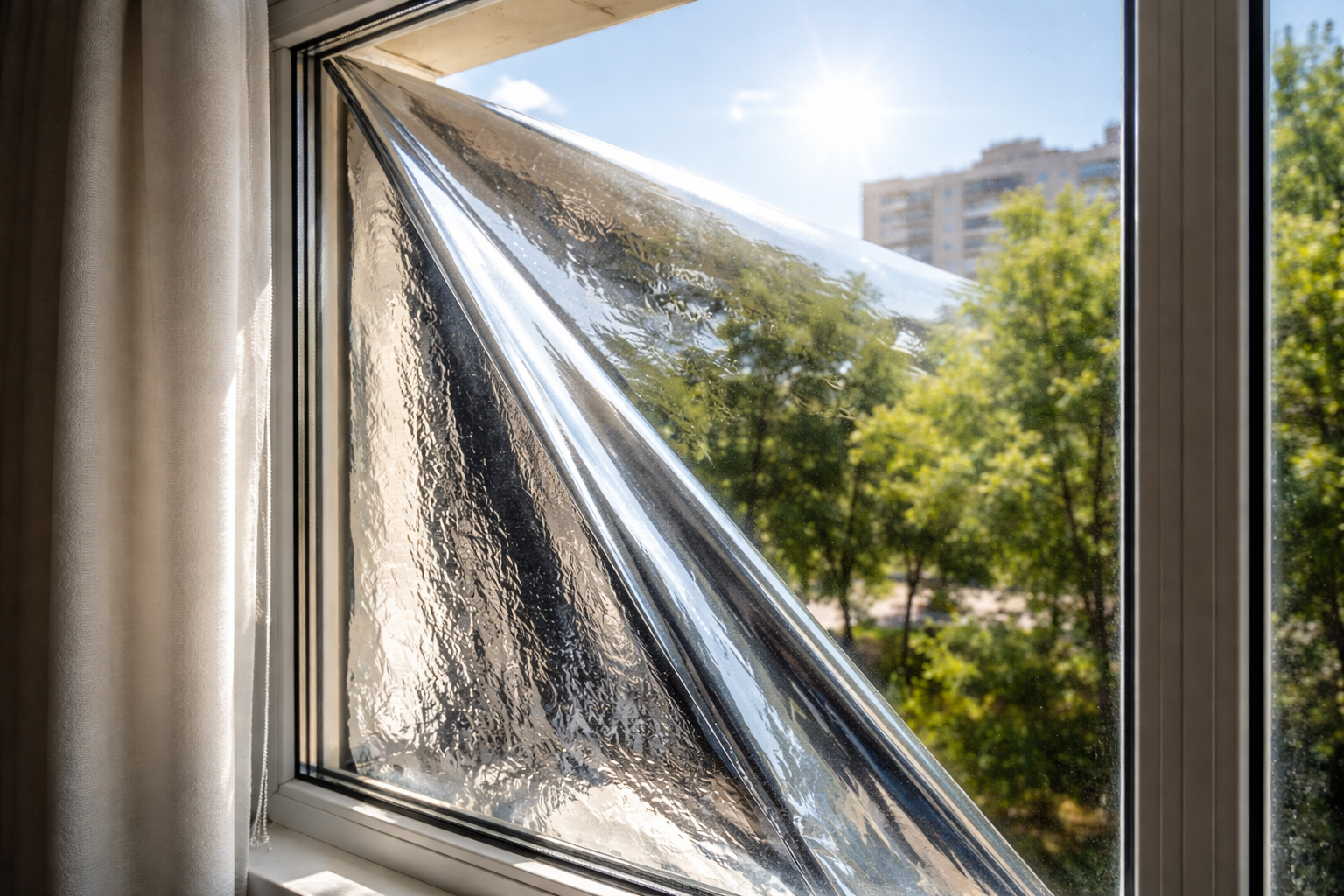 Jedná se o účinné dočasné opatření, ale v případě silného horka se může tenký kov na sklo přilepit, proto je lepší jej opatrně připevnit k rámu malířskou páskou.