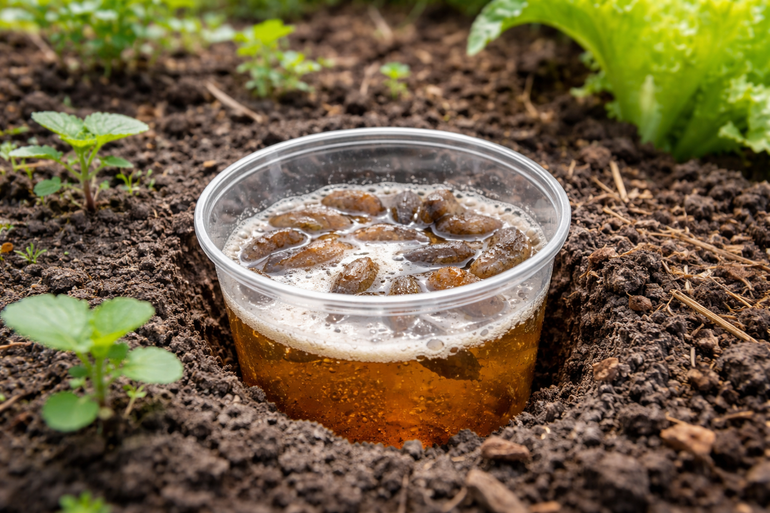 Nalijte tekutinu do nádob a naplňte je přibližně do poloviny. Slimáci přilezou k pachu, spadnou dovnitř a utopí se. Aby nám déšť nezředil návnadu, měli bychom na ni postavit improvizovanou stříšku z jakéhokoli improvizovaného materiálu a nechat na ní mezeru pro průchod škůdců.