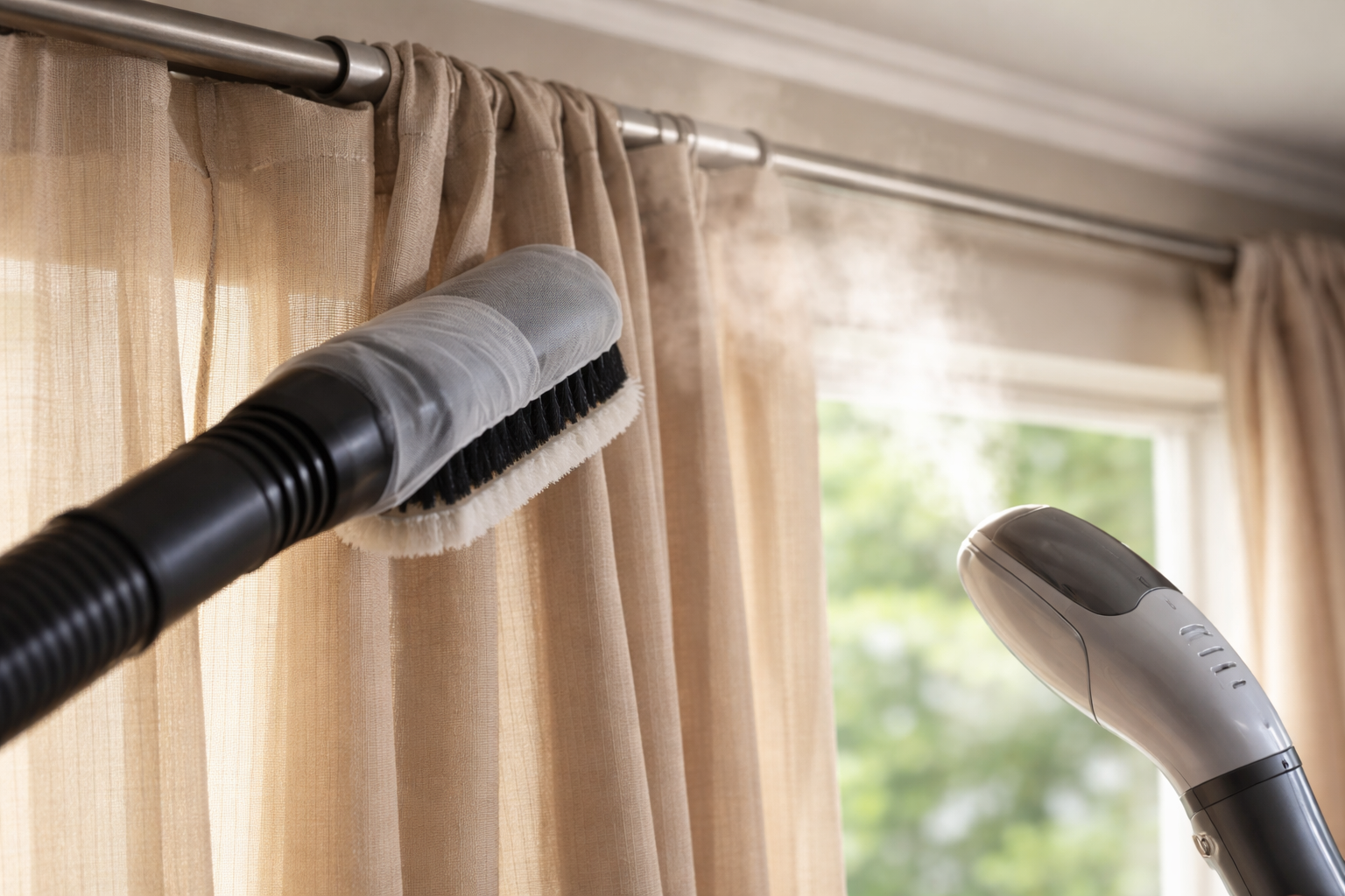 Zvláštní pozornost věnujte hlubokým záhybům, závěsům a hornímu okraji záclonové tyče, kde se hromadí nejvíce prachu.