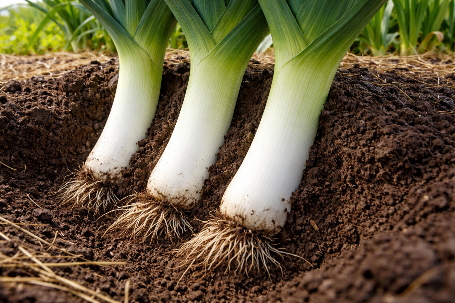 Během léta postupně doplňujte půdu v rýze tak, jak stonek roste, právě toto neustálé přepichování je zodpovědné za dobré vybělení pórku.