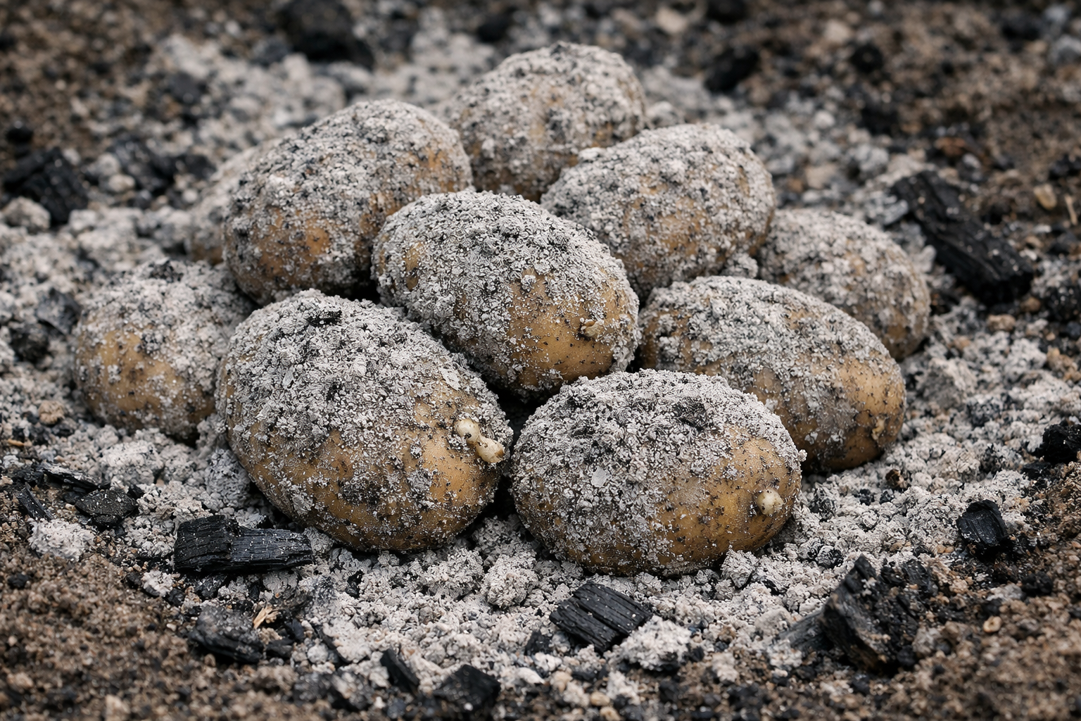 Dřevěný popel obsahuje draslík, vápník и fosfor ve snadno stravitelné formě. Když hlízu obalíme touto sloučeninou, okamžitě se kolem ní vytvoří ochranná a výživná kapsle.