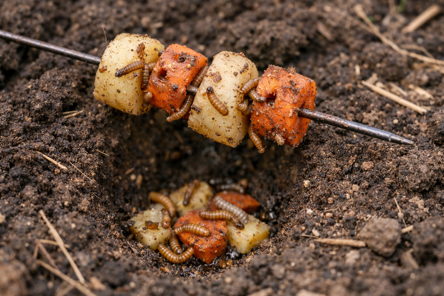 K vytvoření účinné pasti stačí nakrájet staré brambory nebo mrkev na velké kusy. Ty by měly být navlečeny na drát a zakopány deset až patnáct centimetrů hluboko v různých částech zeleninové zahrady.