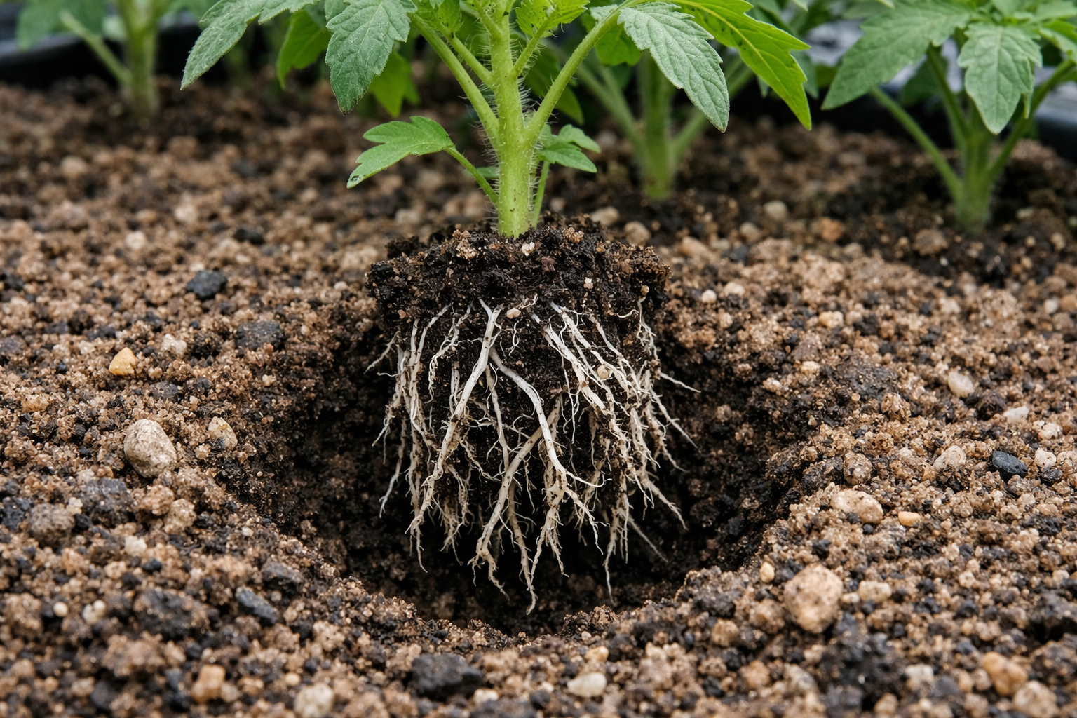 Tajemství spočívá v umělém stresu: kořeny rajčat, které se ocitnou v prázdné půdě, jsou nuceny aktivně se rozšiřovat a hledat výživu, která tvoří pevný základ pro budoucí úrodu.