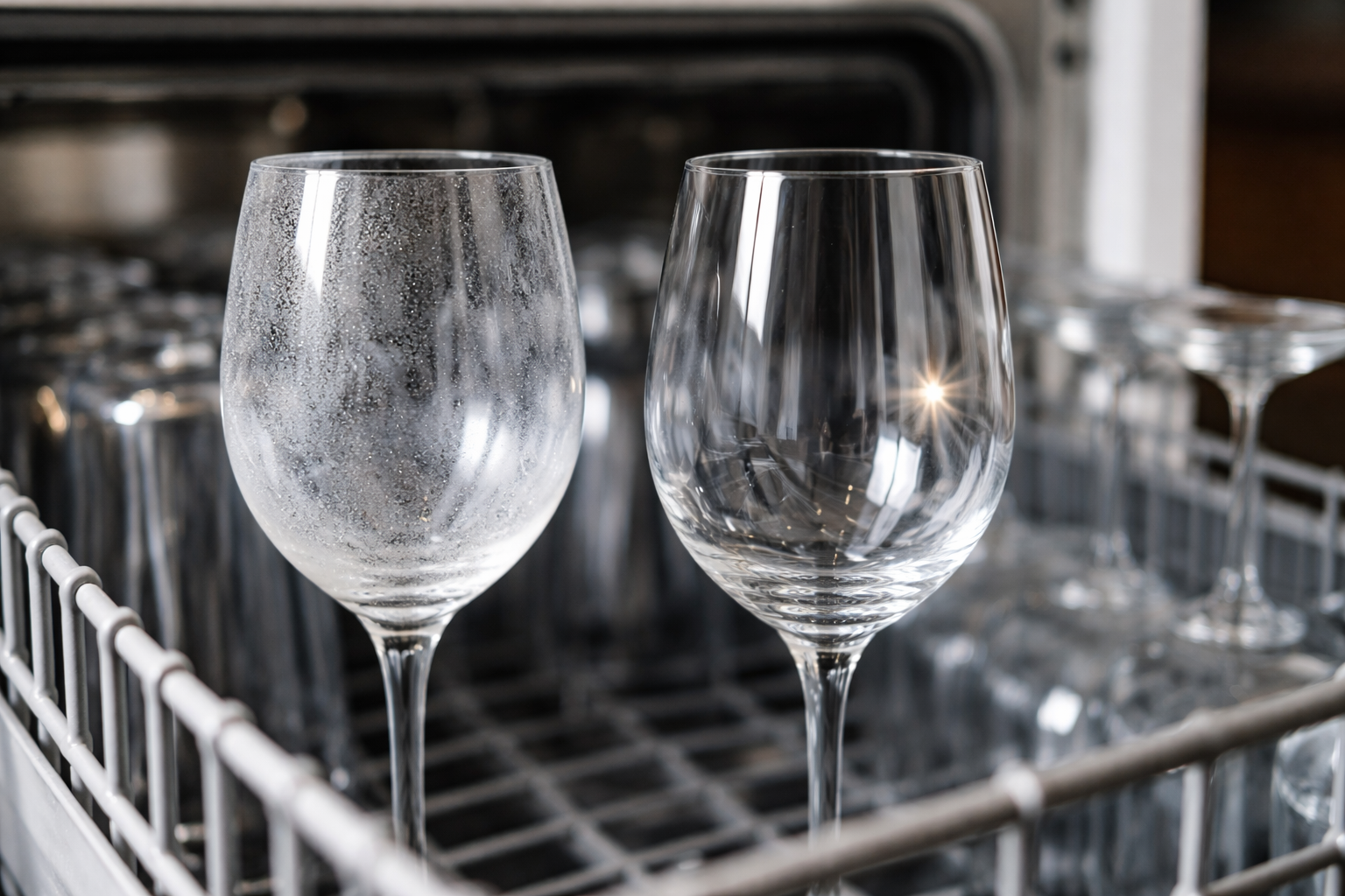 Mnoho lidí viní nekvalitní gel nebo mycí tablety, ale skutečná příčina je jinde. Hlavním nepřítelem dokonalého lesku je tvrdá voda. Obsahuje velké množství vápenatých a hořečnatých solí. Při odpařování vlhkosti z povrchu skel a desek, srážení minerálů Minerální sraženiny nezmizí, ale přilnou ke sklu a vytvoří hustou vrstvu. vodní kámen.