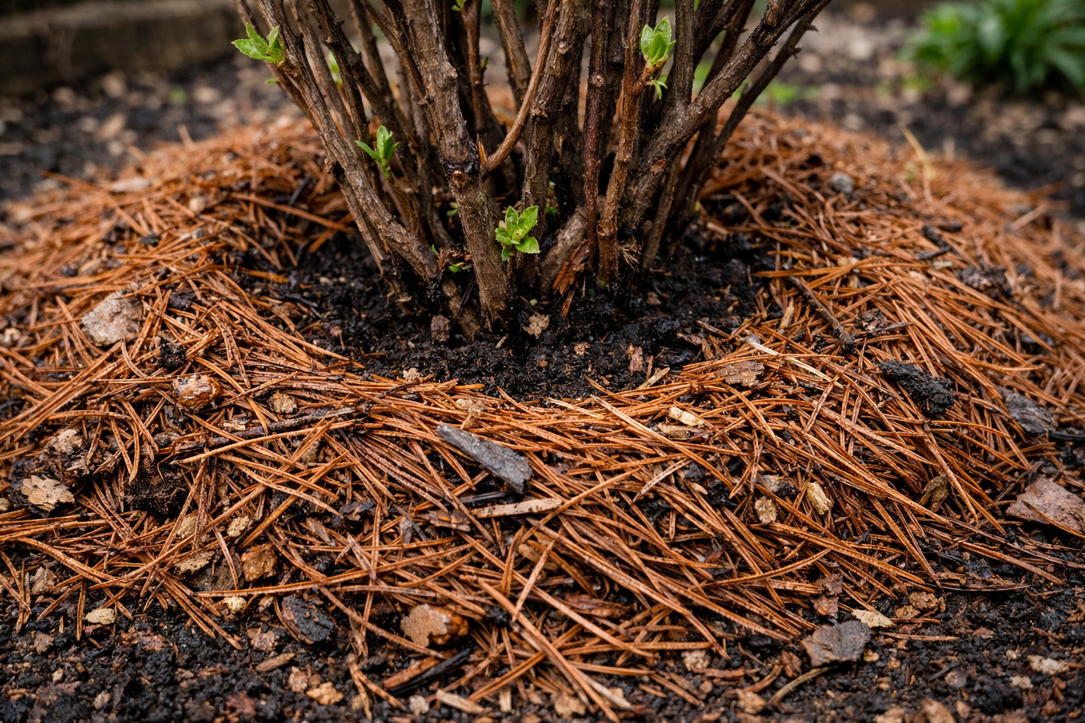 – Nejprve keře vydatně zalijte čistou vodou – Rozprostřete vrstvu humusu nebo kompostu – Jehličí rovnoměrně položte několik centimetrů od kmene – Polštář lehce podložte rukama, aby jej vítr nerozfoukal.