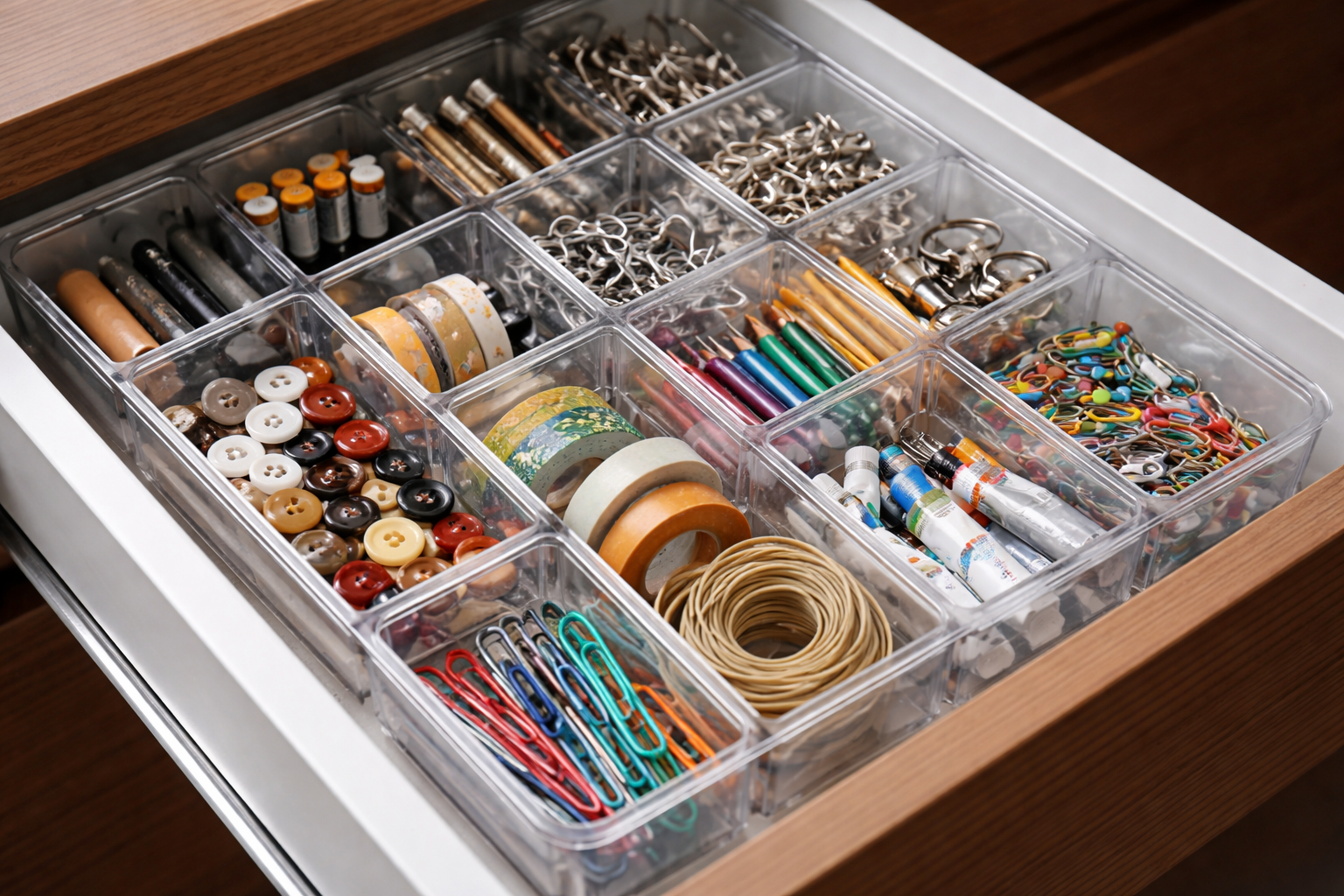 Pokaždé, když potřebujete najít baterii, knoflík nebo šroubek, prohrabáváte se horou harampádí v zásuvkách svého pracovního stolu. Tato známá situace vás okrádá o čas a nervy, ale tento problém lze vyřešit během jediného večera pomocí chytrého systému vertikálního třídění.