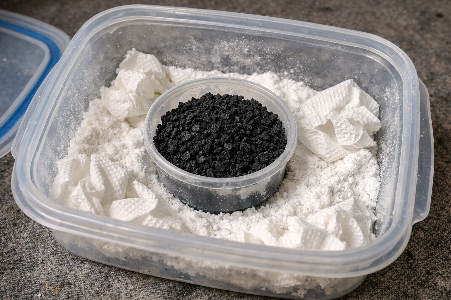 Drcené aktivní uhlí nechte přes noc v uzavřených skříních, aby absorbovalo těkavé chemické sloučeniny.