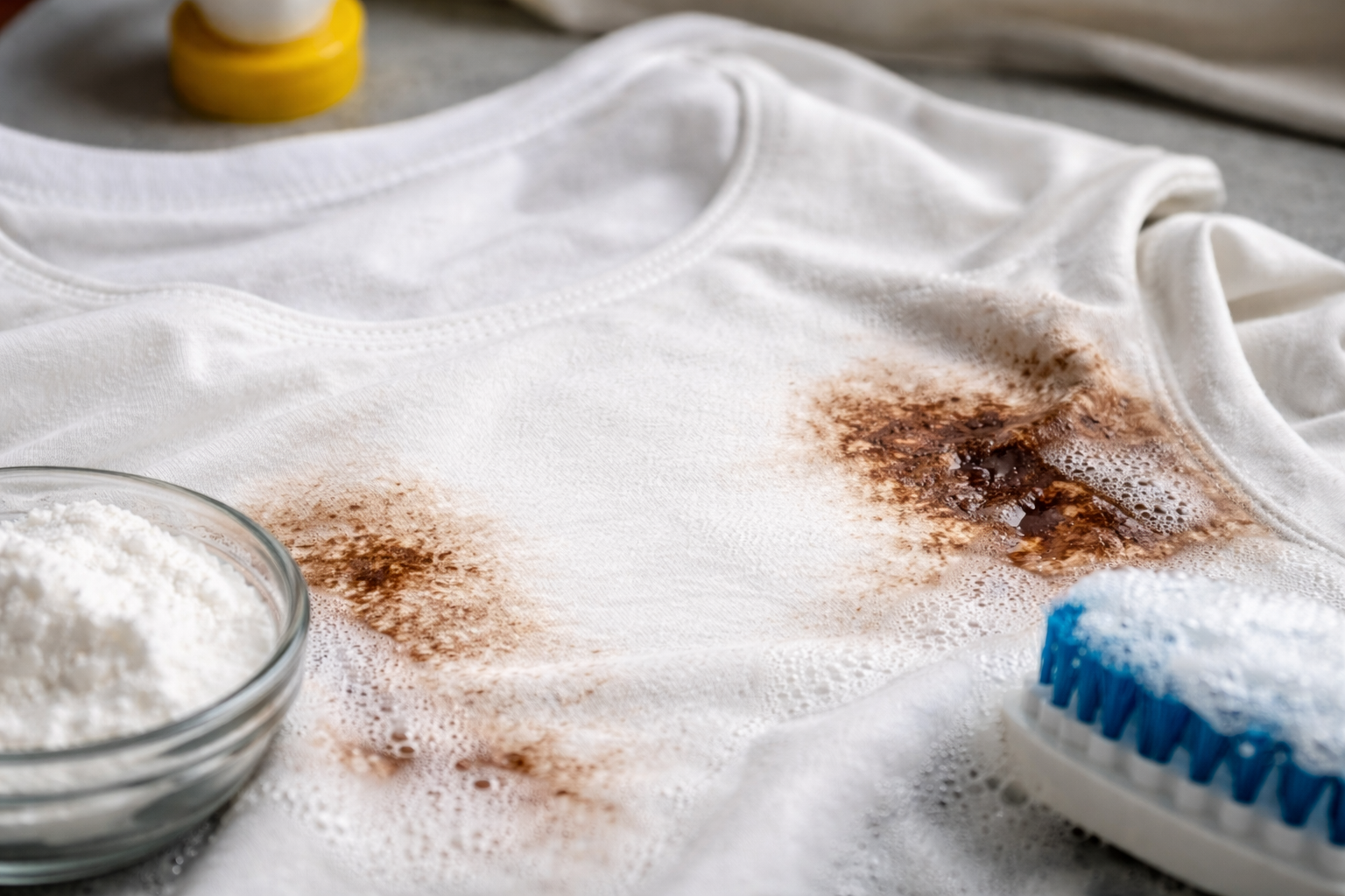 Po rozpuštění tukového základu často zůstane mírný hnědý obrys. S tímto zbytkovým jevem se lze dokonale vypořádat běžným tekutým prostředkem na mytí nádobí, který se aplikuje lokálně před hlavním mytím. Pigment je rozkládán aktivními pěnidly, čímž se vláknům vrací jejich původní čistota.