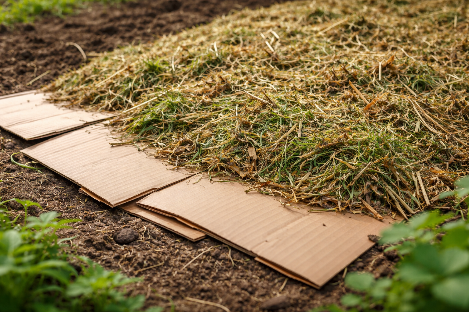 Na plochu s plevelem pevně položte listy obyčejné vlnité lepenky bez lepicí pásky.