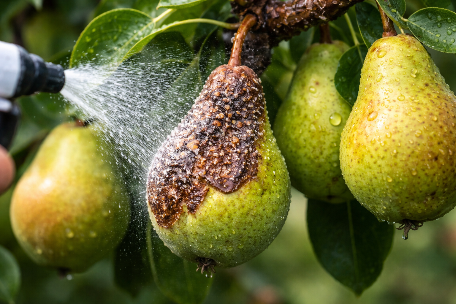 Kromě moniliózy brání jarnímu vývoji stromu často i další sporulující infekce. Zbavují rostlinu vitality, což znamená, že hrušeň nemůže vytáhnout tvorbu plodů a plody opadávají v raném stadiu.