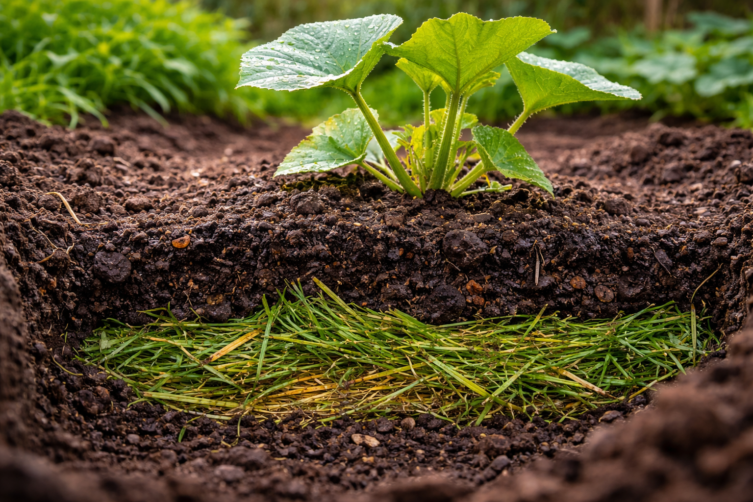 Hlavním tajemstvím rychlého startu je přidání čerstvě posečené trávy na dno výsadbové jámy, která po rozložení působí jako silná přírodní baterie.